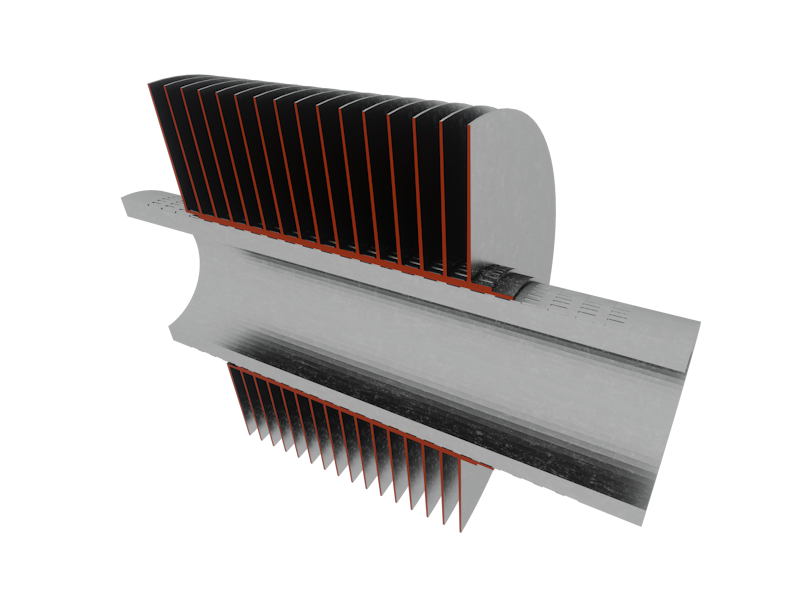 The strip is pre- ormed using a two-stage preform roller set. Following this, the strip is rolled and tension-wound around the base tube. The preformed foot allows the fins to interlock on the tube surface, ensuring continuous contact with the base tube and forming a seal for protection against external corrosion.